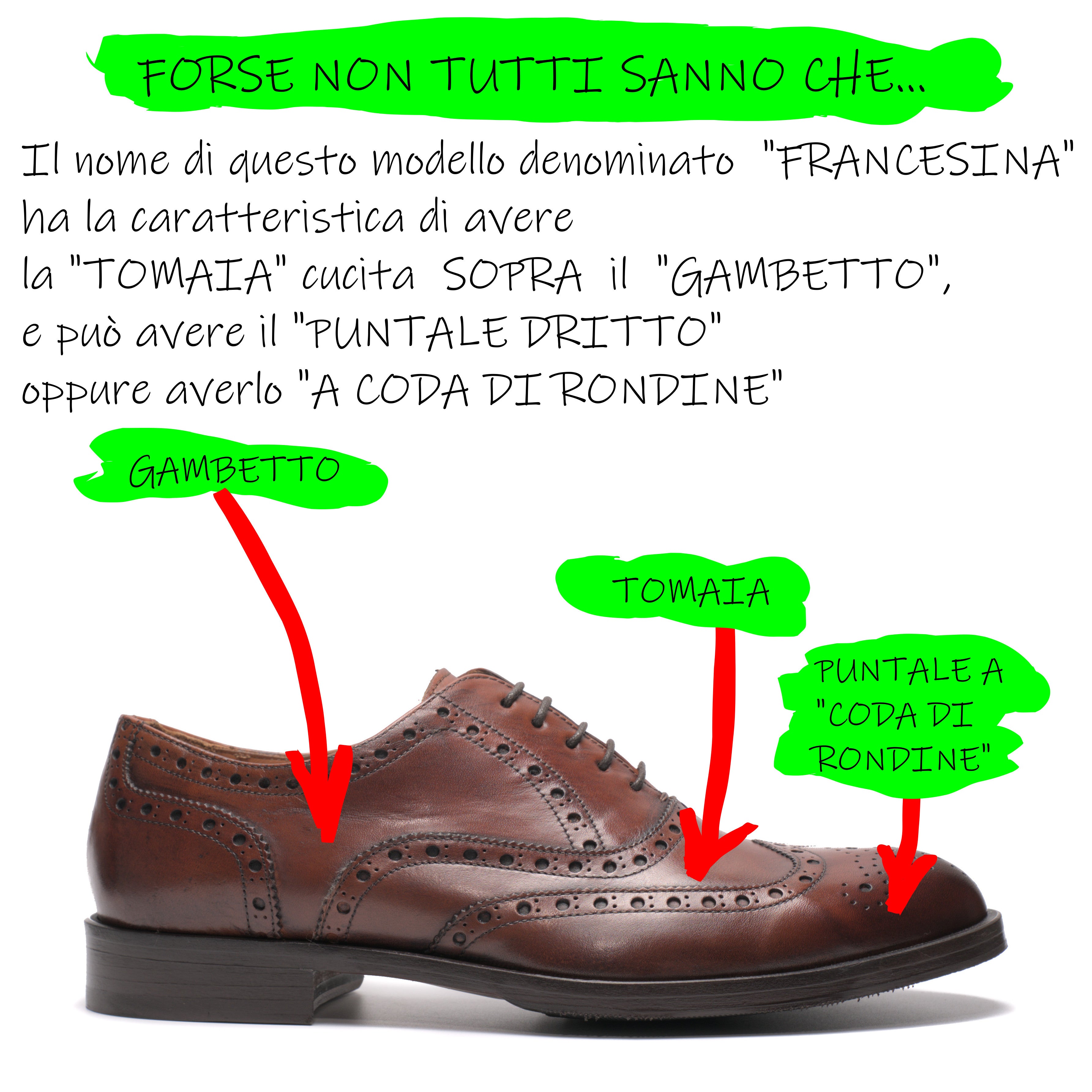 La "FRANCESINA" è una pietra miliare dello stile . Può essere declinata sia al maschile o al femminile e a differenza del modello "DERBY" non è adatto a piedi robusti o con il collo del piede "CAMBRATO" (ALTO).